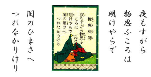 UVa Library Etext Center: Japanese Text Initiative The Japanese Text Initiative, a collaborative effort of the University of Virginia Library Electronic Text Center and the University of Pittsburgh East Asian Library, makes texts of classical Japanese literature available on the World Wide Web. 夜もすがら 物思ふころは 明けやらで閨のひまさへ つれなかりけり 夜もすがら 物思ふころは 明けやらで閨のひまさへ つれなかりけり. よもすがら ものおもふころは あけやらでねやのひまさへ つれなかりけり. 俊恵法師 坊主. 百人一首の意味と文法解説(85)夜もすがらもの思ふ頃は明けやらでね... Mar 12, 2018 · 【夜もすがらもの思ふ頃は明けやらでねやのひまさへつれなかりけり】小倉百人一首から、俊恵法師の和歌に現代語訳と品詞分解をつけて、古文単語の意味や、助詞および助動詞の文法知識について解説しました。また、くずし字・変体仮名で書かれた江戸時代の本の画像も載せております。 ちょっと差がつく『百人一首講座』 | 小倉山荘(ブランドサイト) | 京都せんべい おかき専門店 長岡京 小倉山荘 夜もすがら もの思ふ頃は 明けやらで ねやのひまさへ つれなかりけり: 俊恵法師: 86: なげけとて 月やはものを 思はする かこち顔なる わが涙かな: 西行法師: 87: むらさめの 露もまだひぬ まきの葉に 霧立のぼる 秋の夕暮: 寂蓮法師: 88